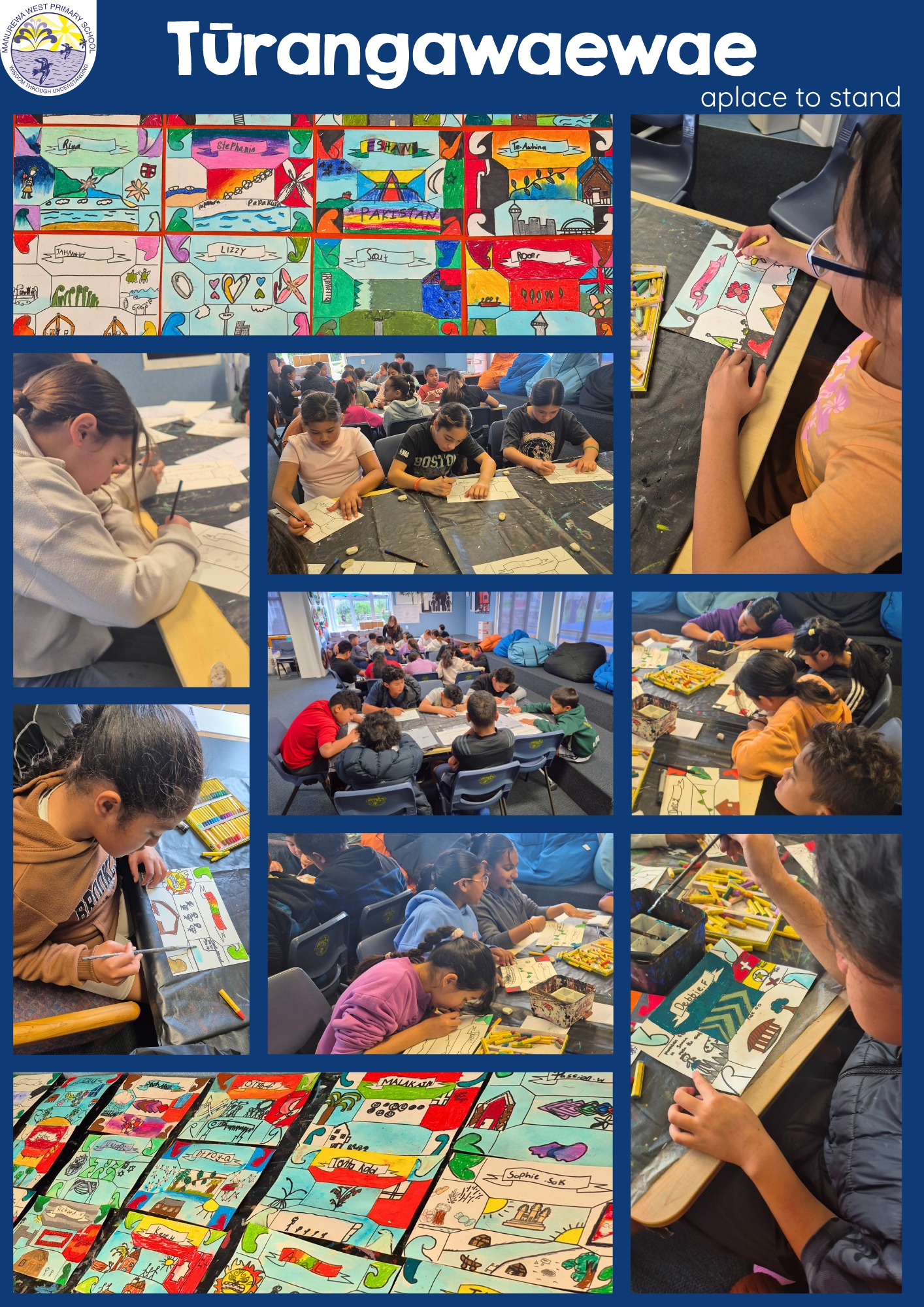 This term, our Tūī Whānau students participated in an exciting art initiative with Te Tuhi, exploring the theme ‘Tūrangawaewae – A Place to Stand’. We studied artists who express their sense of tūrangawaewae through their work and reflected on what this concept means to us personally. Understanding tūrangawaewae helped us think deeply about our identity, our connections, and our place in the world. During our Te Tuhi workshop, we experimented with a variety of materials and imagery to design individual symbols that represent who we are. These artworks now form a collective waharoa or gateway in our classroom, welcoming visitors and celebrating our shared sense of belonging.